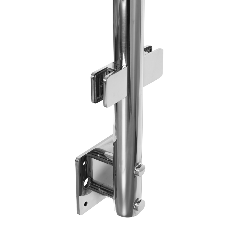 Słupek balustradowy dedykowany balkonom francuskim to gotowy do montażu element systemu balustrad szklanych mocowanych bezpośrednio do fasady budynku. Spawana konstrukcja ze stali nierdzewnej AISI 304 gwarantuje wysoką nośność, a uchwyty 45 × 45 mm stabilnie zaciskają szkło o grubości 6 – 10,76 mm, zabezpieczając portfenetr na wysokości drzwi balkonowych.